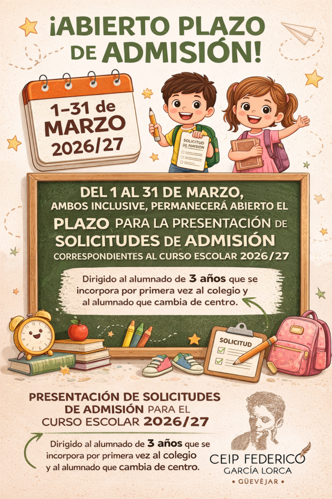 Del 1 al 31 de marzo, ambos inclusive, permanecerá abierto el plazo para la presentación de solicitudes de admisión correspondientes al curso escolar 2026/27.  Se inicia de este modo el proceso de escolarización en el que participan todos los niños y niñas que se incorporan por primera vez a nuestro colegio (alumnado de 3 años), así como el alumnado que cambie de centro y solicite la admisión en nuestro colegio.